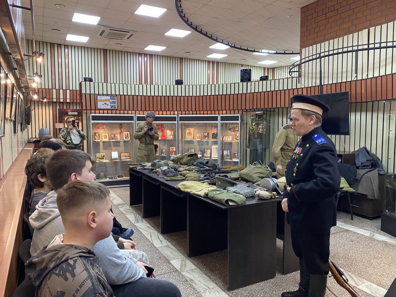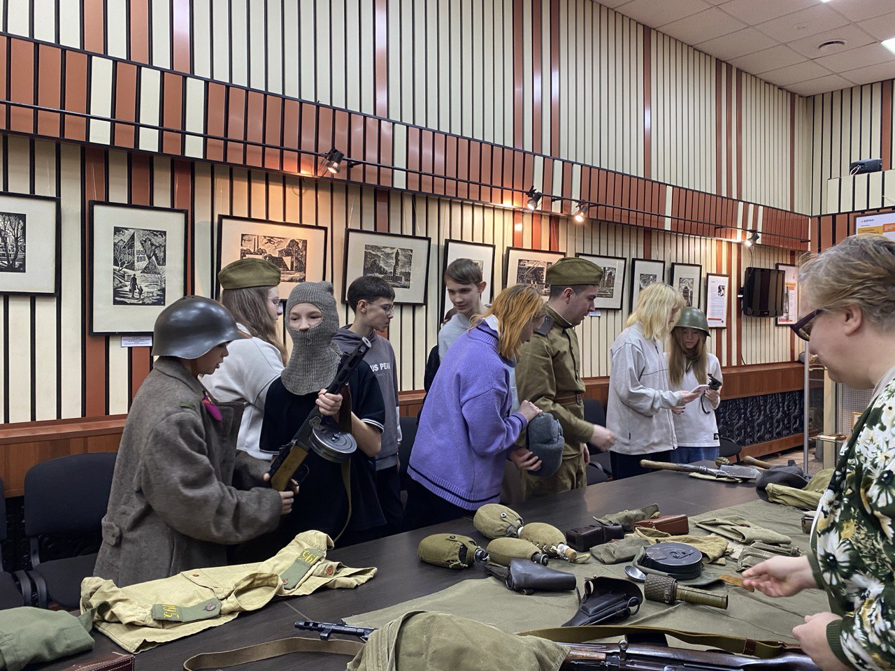 Ребята не только увидели, во что одевался и каким оружием сражался русский солдат, но и подержали в руках гранаты, солдатские фляги, вещмешки, и, конечно, образцы стрелкового оружия времен войны – винтовку Мосина и пистолет-пулемет Шпагина. У школьников была уникальная возможность примерить легендарную «буденовку», шинель, шапку-ушанку, каску.